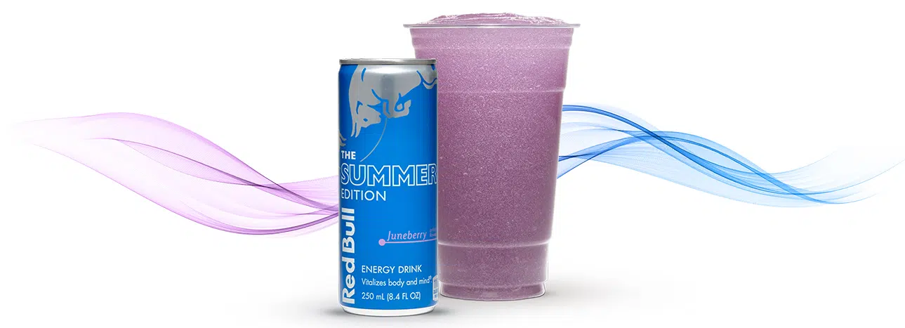 Sweet, engergizing Juneberry Red Bull infused with tropical coconut flavors. Available iced or frozen.
