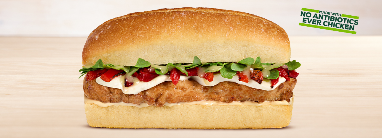 Fresh meets flavorful. The Chicken Mozzarella Subwich layers no-antibiotics-ever roasted chicken with locally-sourced mozzarella, roasted red peppers, baby arugula, signature QC vinaigrette, and garlic aioli on 5-inch fresh baked bread.