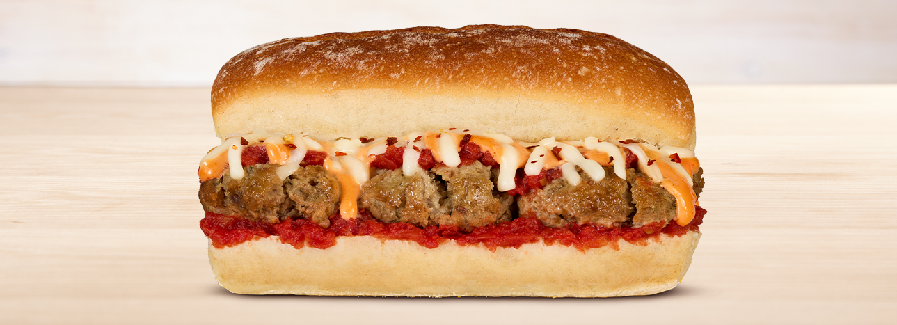 Big flavor in every bite. The Smashed Meatball with Marinara & Vodka Sauce Subwich combines smashed meatballs, marinara, and creamy vodka sauce with a kick of crushed red pepper, shredded mozzarella, and parmesan on 5-inch fresh baked bread. Try with fresh, locally-sourced mozzarella!