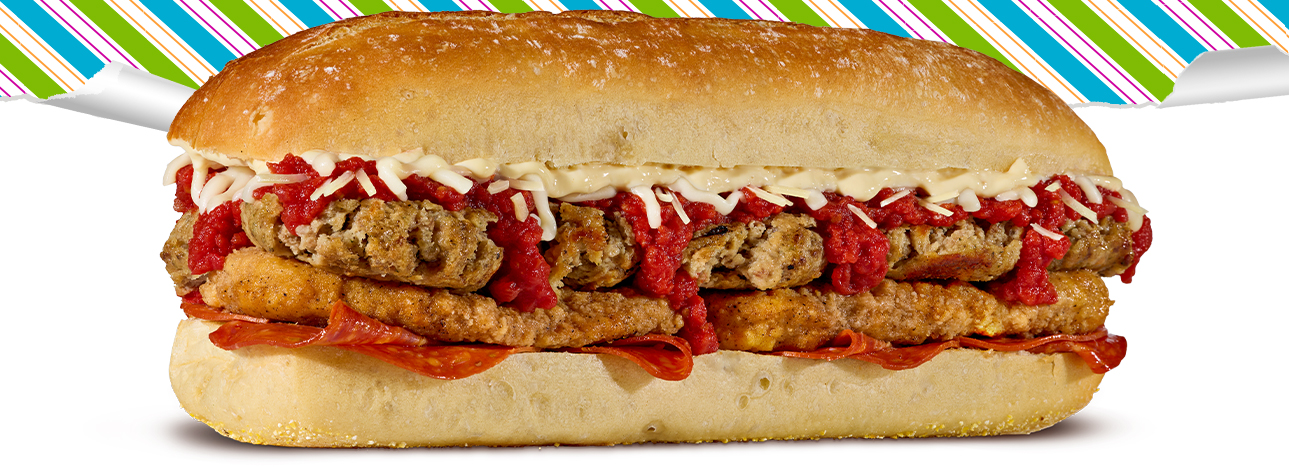 Big flavor in every bite. The Smashed Meatball with Marinara & Vodka Sauce Sub combines smashed meatballs, marinara, and creamy vodka sauce with a kick of crushed red pepper, shredded mozzarella, and parmesan on 9-inch fresh baked bread. Try with fresh, locally-sourced mozzarella!