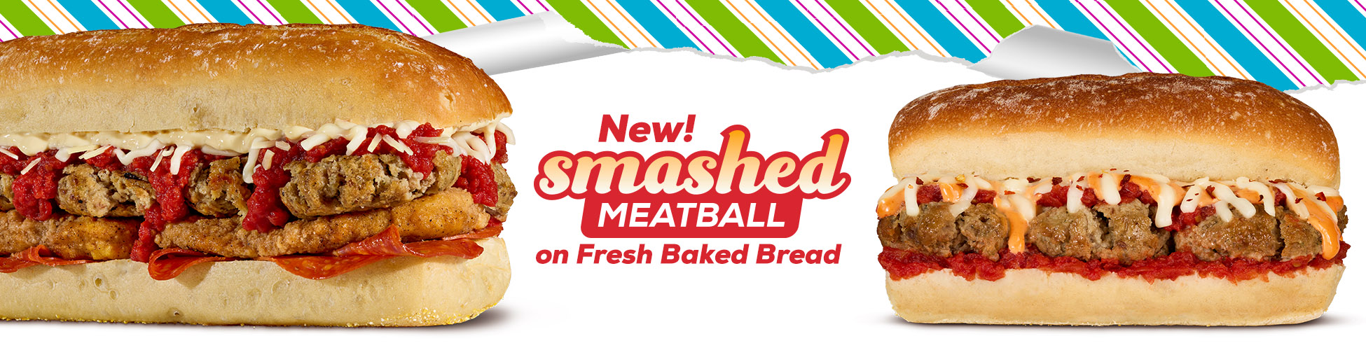 Smashed to satisfy. The Smashed Meatball Sub layers pepperoni, smashed meatballs, marinara, shredded mozzarella, and parmesan on 9-inch fresh baked bread. Try with fresh, locally-sourced mozzarella!
